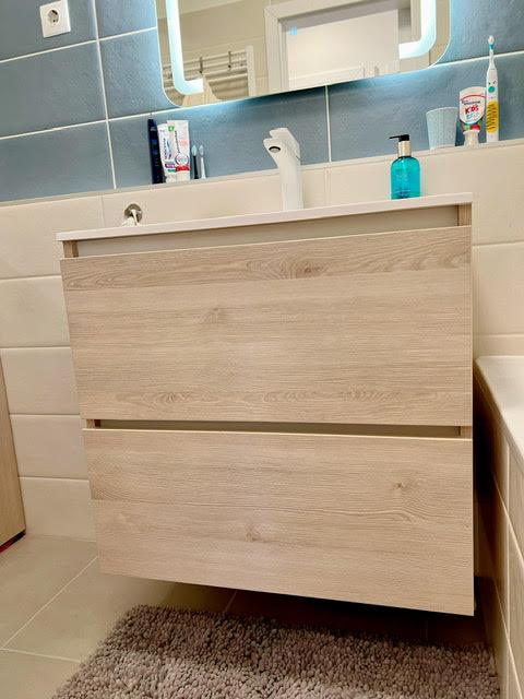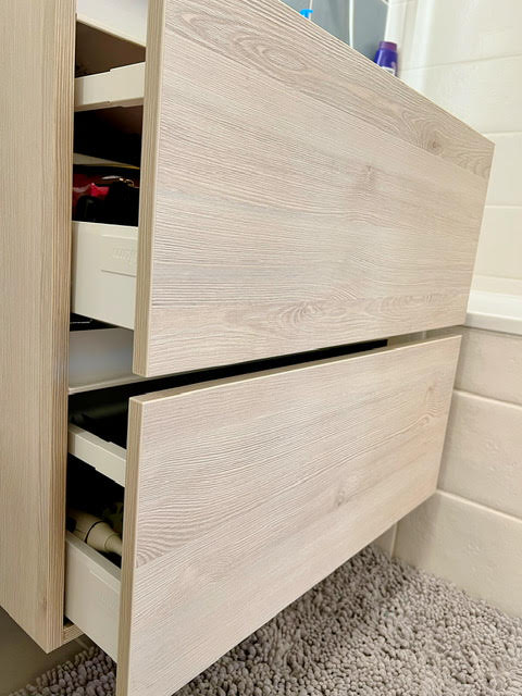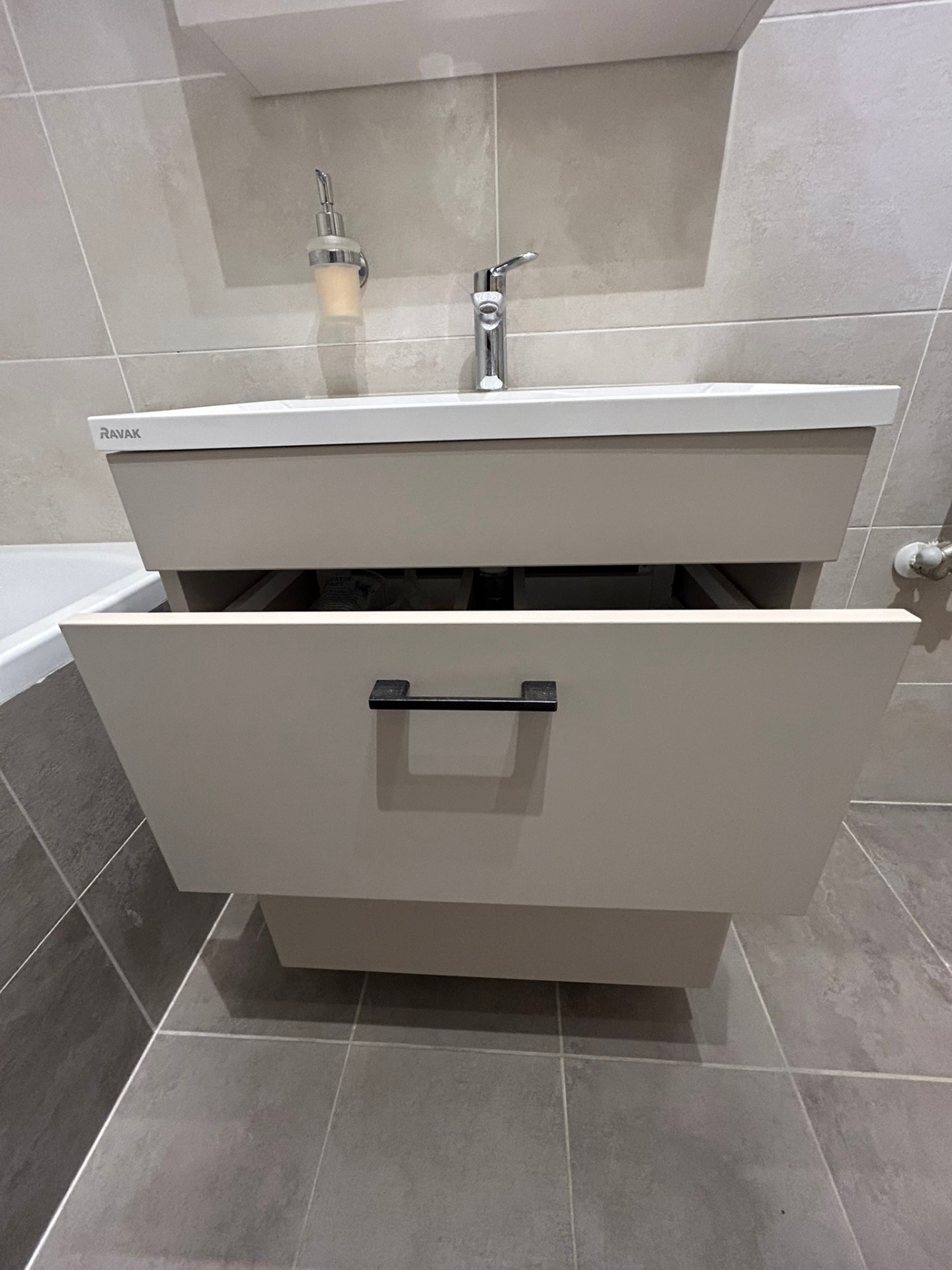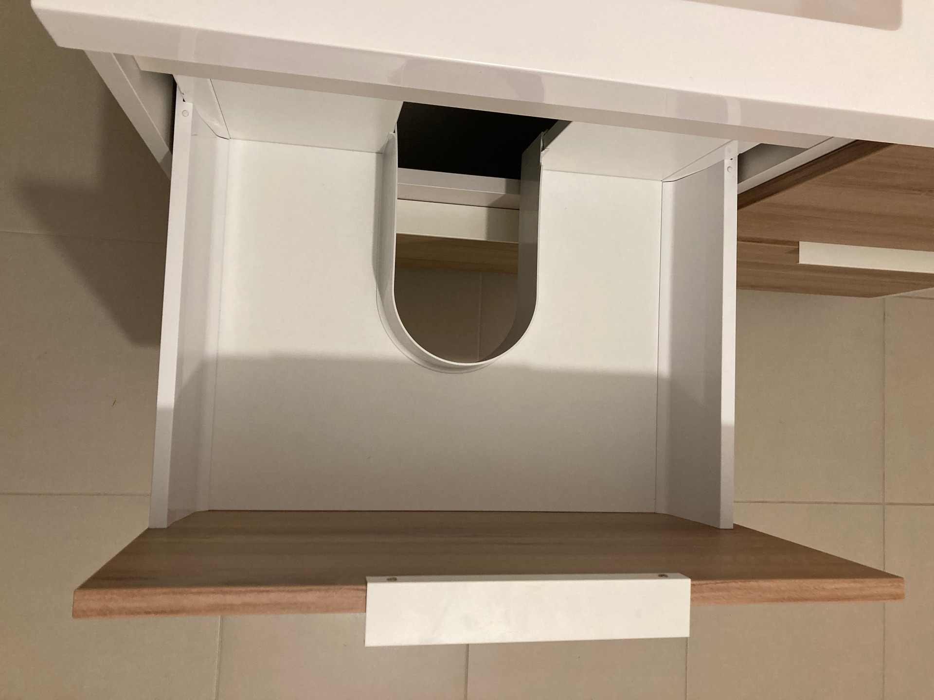 Vasalatok: Blum beépített fékezős fiókok. Felső fiók feneke kivágva, hogy a szifon is elférjen. A fogantyú nélküli design-t gola vasalattal fogantyúval oldottam meg.